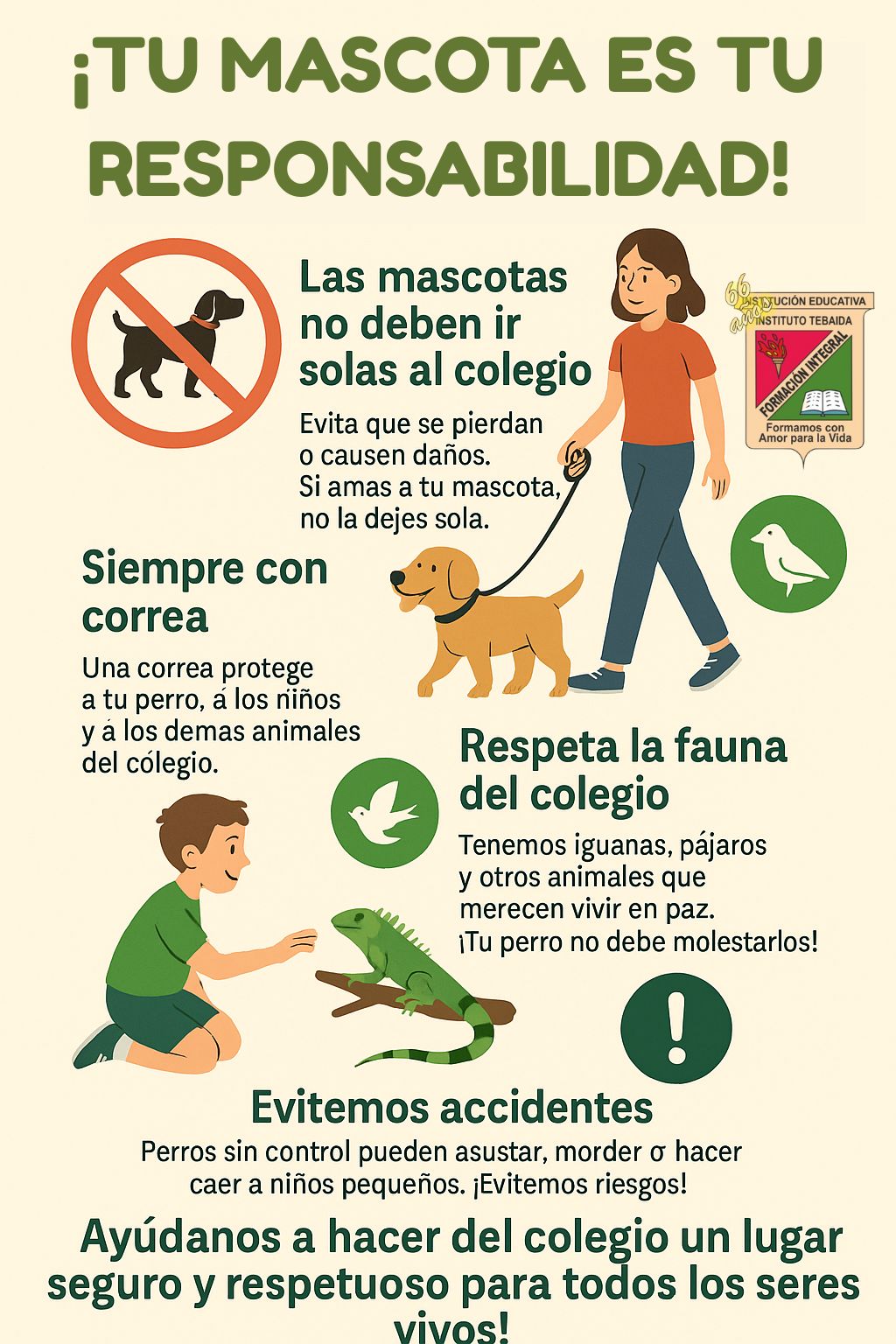 🎒🐾 ¡Cuidar a tu mascota es cuidar de todos! 🐶🐦🦎 En el Instituto Tebaida amamos a los animales y valoramos su presencia en nuestro entorno escolar. Por eso, te recordamos que la tenencia responsable de mascotas también es parte de la formación en valores. 🐕🦺 Evita traer perros sin correa al colegio: pueden perderse, asustarse,